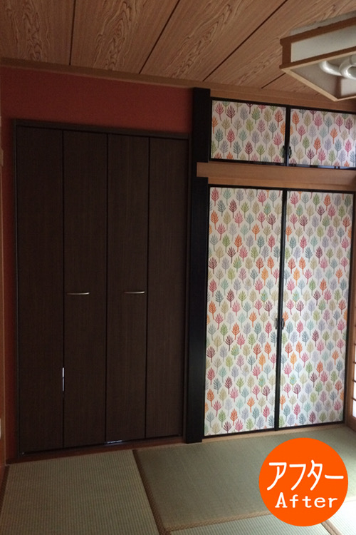 中古住宅を買ったお客様からのご要望で床の間にクローゼットを取り付けました。予算もあり、開けると収納の床は床板のままとなっておりますが、使用する上では全く問題はございません。